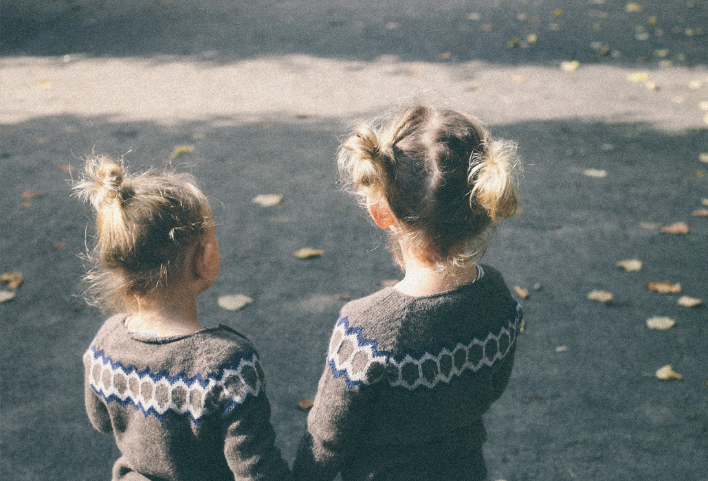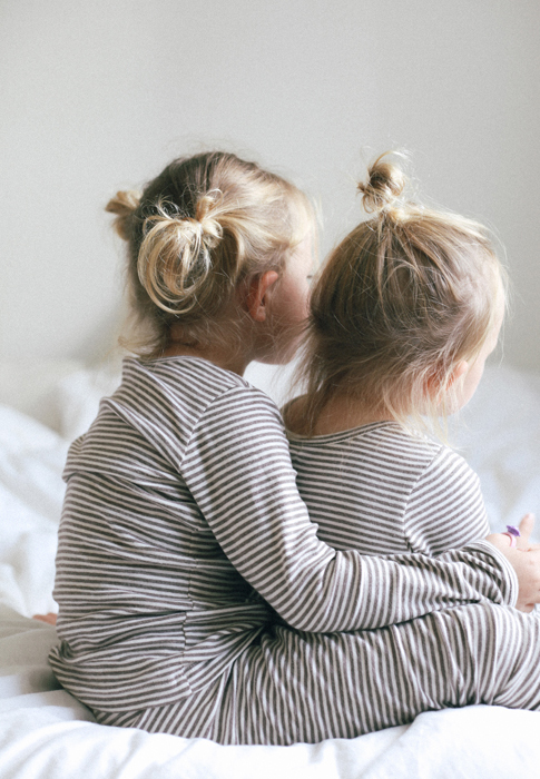 Olivia and Elinor are wearing matching Raglan Sweaters in colour brown, as well as matching stripes in colours iron/ecru. The raglan sweater is available here, the striped blouse here, and the matching leggings here.